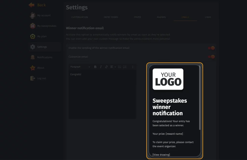 Make your sweepstakes look truly yours. Your customised logo now appears in: