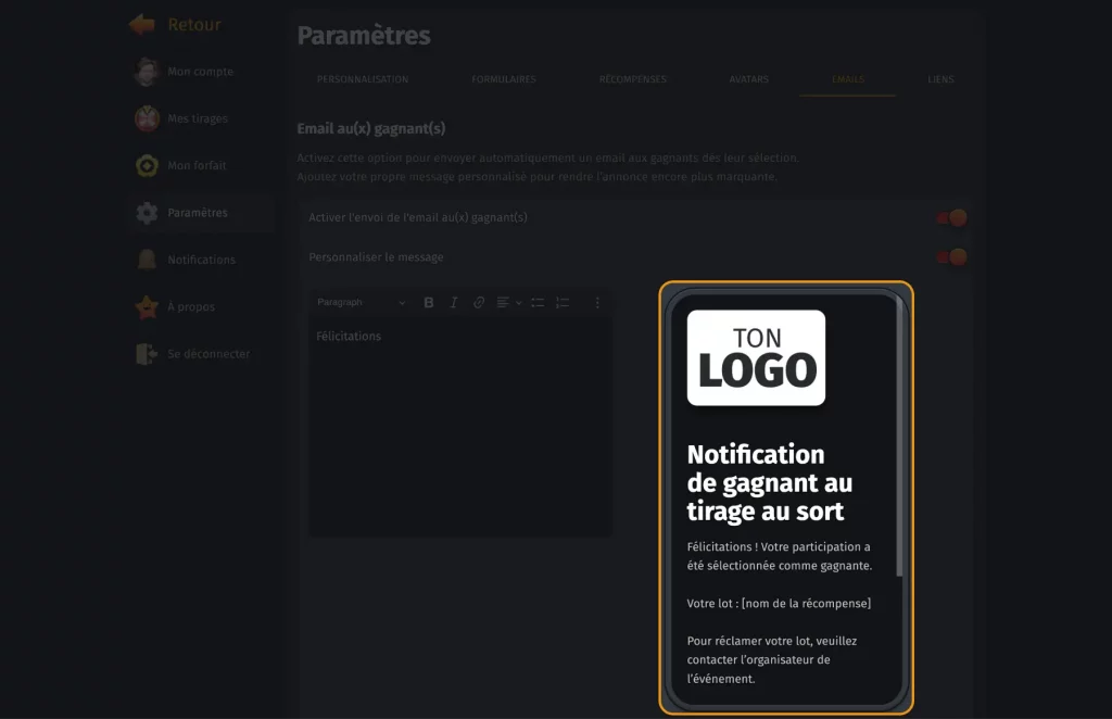 - les e-mails récapitulatifs envoyés 12 heures après la fin du tirage (si activés).